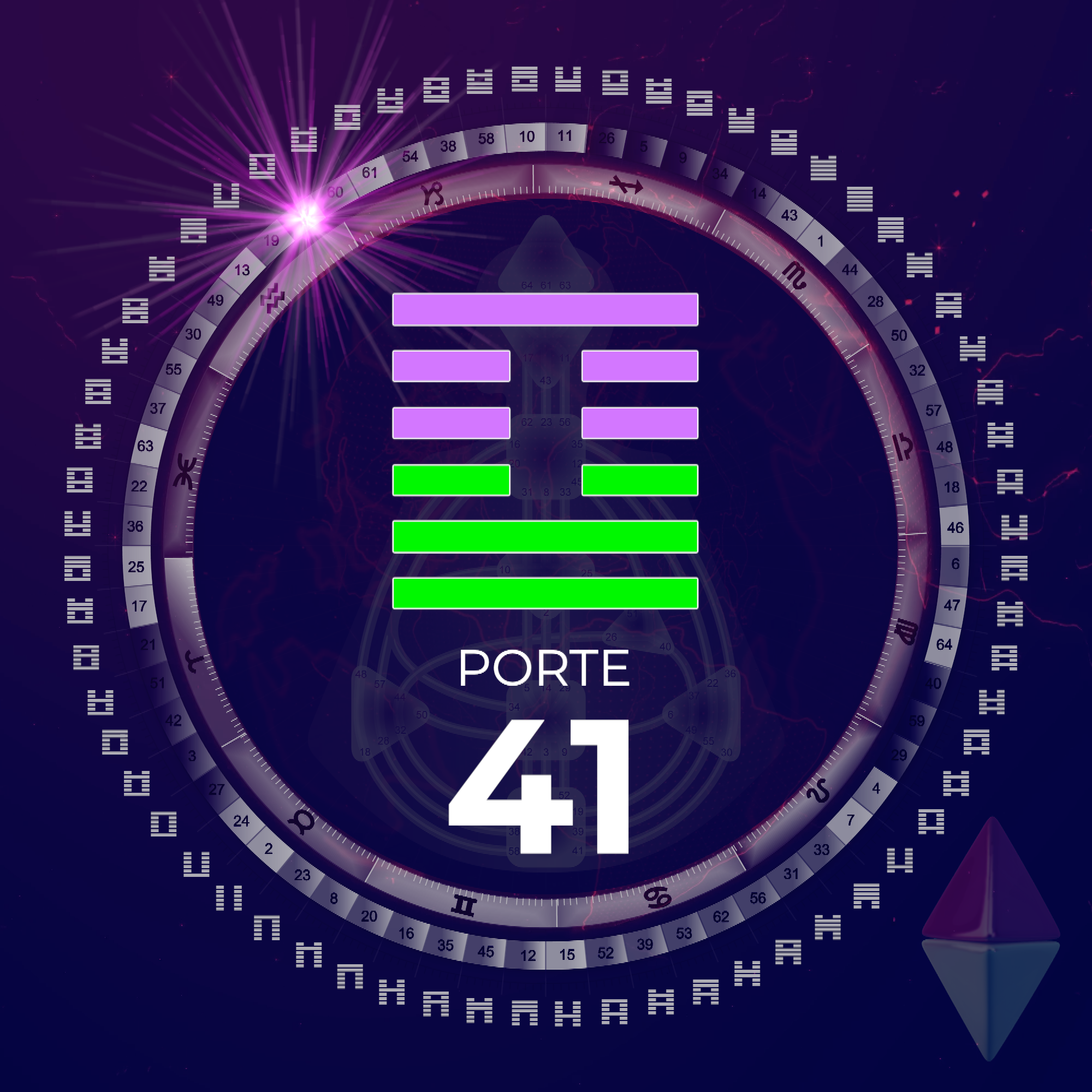 La porte 41 est la porte de la contraction et du commencement des cycles. Elle initie le désir et, sur le plan génétique, met en mouvement un nouveau cycle d’expérience.